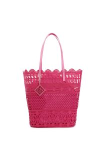 Shopper aus spitze mit passendem innenbeutel aus baumwolle. griffe in lederoptik und ton-in-ton-anhänger. perfekt um jedem sommerlook farbe zu verleihen.