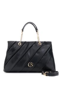 Einkaufstasche aus Kunstleder mit Falten vorne, Reißverschlusstasche hinten und Inneneinteilung. Gepolsterte Griffe mit Metallkette mit Café Noir-Logo und abnehmbarem Schulterriemen.