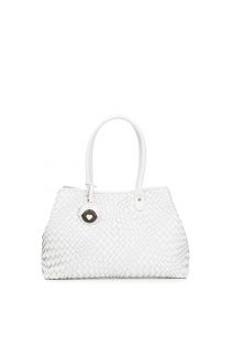 Offene Shoppingbag mit internem Band, verziert durch ein Flechtmuster unregelmäßiger Größe und röhrenförmige Griffe. Personalisierter Anhänger