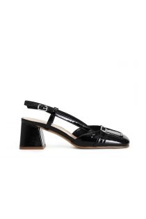 Offene schuhe aus lackleder mit mokassin-optik und schmuckschnalle. abgerundete schuhform. eine mischung aus loafer und pumps. schnürung hinten. 45 mm hoher absatz. sehr bequem perfekt für den täglichen gebrauch.