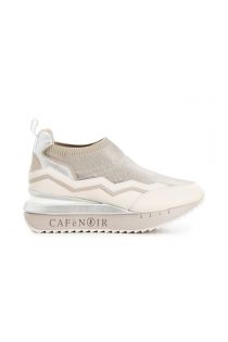 Slip-ons aus lurexstoff und leder laufsohle mit einsatz und logo. die lederpartie ist durch ein feines zickzackspiel mit dem stoff verbunden.