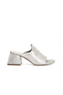 Slipper aus laminiertem wildleder. die innensohle ist aus leder. schuh der dank des 6.3 cm hohen breitabsatzes und der bequemen stützbasis den ganzen tag getragen werden kann.