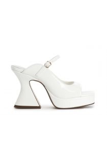 Slipper in lacklederoptik mit riemchen und schnalle auf dem fußrücken und plateau. 90 mm hoher barockabsatz. ein bequemer schuh der sich durch seine quadratische spitze auszeichnet. einfaches umhüllendes obermaterial.