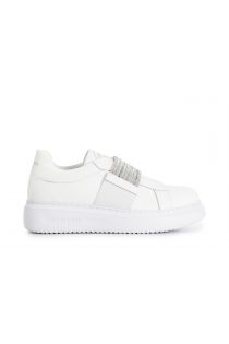 Slipper-sneaker mit einem mit strassbesetztem gummiband. schaft und innensohle leder. hochgezogene sohle.