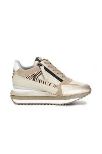 Sneaker aus Leder mit seitlichem Reißverschluss und auffallenden Einsätzen aus Cavallino-Leder in Animalier-Optik und laminiertem Lederimitat. Zweifarbige erhöhte Sohle und Nieten an der Ferse