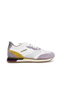 Sneaker aus leder und stoff mit mehrfarbigen einsätzen und einer leichten bunten laufsohle