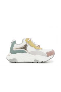 Sneaker mit silberfarbenen Glitzereinsätzen an der Sohle. Der Oberschuh ist aus mehrfarbigem Rauleder und Nylon. Die mit dem CafèNoir-Logo personalisierte mehrfarbige Kette ist Teil der Schnürung und abnehmbar.