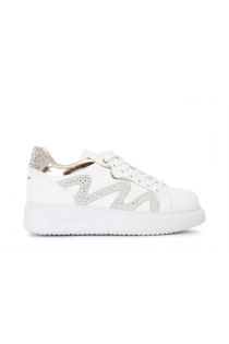 Sneaker mit nieten an der seite und strass an der schuhspitze. schaft und innensohle leder. geschnürter verschluss. hochgezogene sohle.