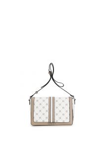 Starre tasche mit langer klappe die mit einem verstellbaren schulterriemen getragen werden kann kontrastierendem allover-logo-print und vertikalen streifen in der mitte der klappe.
