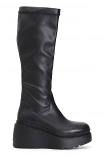 Stiefel mit Stretch-Schaft, die sich wie eine zweite Haut anschmiegen. Sohle mit Keilabsatz, der durch ein erhabenes Logo die Blicke auf sich zieht