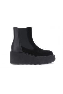 Stiefeletten aus Wildleder für Damen mit Einsätzen aus Glattleder. Elastisches Design, 7,5 cm Absatz und 4 cm Plateau. Komfort und Stil für moderne, urbane Looks.
