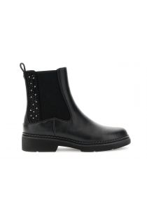 Schwarze Damen-Ankle-Boots aus Kunstleder mit elastischen Seiteneinsätzen. Strass- und Nietenverzierungen an der Ferse verleihen ihnen einen Hauch von Glamour. Lederinnensohle. 3,5 cm Absatz.