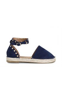Hinten geschlossene sandalen mit einem knöchelriemchen aus stoff und nieten auf hanfsohle.
