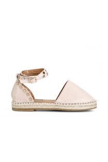 Hinten geschlossene sandalen mit einem knöchelriemchen aus stoff und nieten auf hanfsohle.