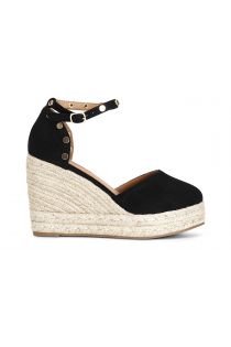 Sandalen mit keilsohle aus hanf und knöchelriemchen aus stoff vorne und hinten geschlossen mit goldfarbenen nieten.