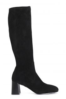 Mikrofaserstiefel mit elastischem obermaterial. reißverschluss innen. bequemer schuh mit innovativem und raffiniertem stil aber auch sehr feminin. die spitze und der 65-mm-absatz sind quadratisch. die innensohle ist aus leder.
