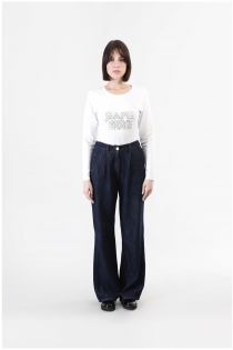 Superweit geschnittene jeans mit elastischem bund hinten. kleidungsstück aus weichem und fließendem festem denim-canvas. jeans die ihre bewegungen sanft begleiten mit lockerer passform perfekt als basis für die kreation ihres lässigen stils.