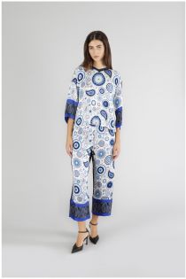 Box-fit-sweatshirt aus zwei materialien mit ellenbogenlangen ärmeln. die vorderseite und die ärmel sind aus bedrucktem viskose-satin und die rückseite aus jersey.