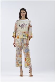 Sweatshirt aus zweifachmaterial in kastenform mit ellbogenlangen ärmeln. die vorderseite und die ärmel sind aus bedrucktem viskosesatin die rückseite ist aus jersey gefertigt.