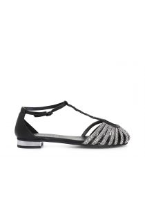 „t“-käfigsandalen aus leder mit mikro-strassverzierung und aufnäher auf der rückseite. futter und innensohle sind aus leder. der absatz beträgt 2 cm.