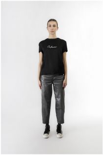 Kurzarm-t-shirt aus zwei materialien. die vorderseite des t-shirts und die ärmel bestehen aus viskosesatin mit unserem logo als glitzereffekt. die rückseite ist aus viskose-jersey.