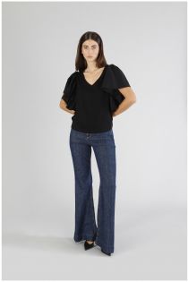 T-shirt aus zwei materialien mit rüschen an den schultern und v-ausschnitt. modell ausgestattet mit einer mundförmigen brosche. perfekt für lässige oder elegantere looks.