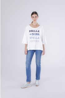 T-shirt aus stretch-baumwolljersey mit 3/4-ärmeln und weitem halsausschnitt. der mehrfarbige strassprint „shine more than a starfish“ verleiht dem look einen hauch von glanz und lässiger eleganz. das model ist 171 cm groß und trägt größe s. passform: bequem