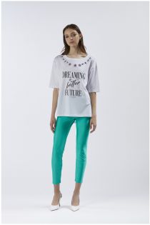 T-shirt aus baumwolljersey. schriftzug „dreaming a better future" und strassbesetzte blumen- und blattapplikationen am ausschnitt. die ärmel sind ellbogenlang.