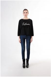 Fledermaus-langarm-t-shirt aus stretch-baumwolle mit geflocktem „good times“-print und gesticktem cafènoir-logo.