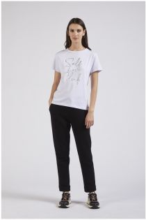 Kurzärmeliges t-shirt aus stretch-baumwolljersey mit silberdruck. das dekolleté ist mit einer schmuckkette verziert.