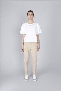 Kurzarm-T-Shirt aus Baumwolljersey mit Rundhalsausschnitt und Ziersteinen am Halsausschnitt. Lässiger Schnitt und reguläre Passform – perfekt für schlichte und farbenfrohe Outfits. Das Model ist 173 cm groß und trägt Größe S.