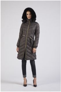 Taillierte daunenjacke mit kapuze und abnehmbarem kunstfellbesatz.