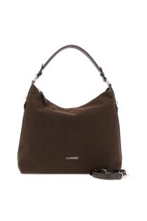 Weiche Tasche in Wildlederoptik mit Reißverschlussanhänger und Metallbuchstaben. Abnehmbarer Schulterriemen und ein raffinierter Look für Alltagsoutfits mit Boho-Chic-Touch.