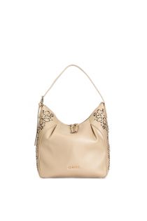 Elegante tasche mit falten verziert mit floralem laserschnitt und dekorativen nieten. ausgestattet mit einem verstellbaren griff mit schnalle für individuellen komfort.