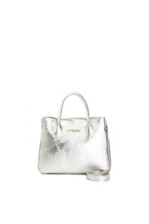 Tasche mit röhrenförmigen henkeln aus metallic-leder. klappenverschluss und interne reißverschlusstrennwand. abnehmbarer schultergurt