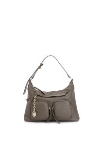 Tasche mit vordertaschen und personalisiertem metallanhänger. einzelfach und innentasche mit reißverschluss. reißverschluss.