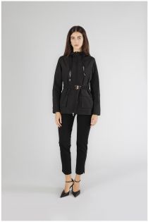 Ein unverzichtbares kleidungsstück in der frühlingsgarderobe. kurzer staubmantel mit kapuze und gürtel mit logo-schnalle aus technischem stoff. lange ärmel.