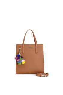 Shopping bag mit abnehmbarem farbigem anhänger. tasche mit verstellbarem schultergurt. die tasche wird mit einem reißverschluss geschlossen.