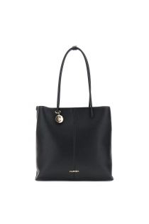 Tragetasche aus Kunstleder mit verschiebbaren, röhrenförmigen Tragegriffen, abnehmbarem Anhänger und Metallbuchstaben. Klares und vielseitiges Design für einen eleganten und funktionalen Stil.