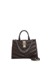 Tragetasche mit gepolsterten streifenapplikationen. twist turn lock-verschluss mit cafènoir-logo. die tasche ist in verschiedene fächer unterteilt: eine mit reißverschluss verschlossene trennwand und eine kleine tasche mit reißverschluss. doppelter schultergurt beide mit kette und aus dem gleichen material wie die tasche.