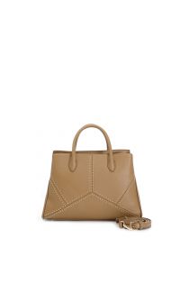 Tote mit patchwork-verarbeitung und mikronieten-applikationen. in verschiedene fächer unterteilte tasche: eine mit reißverschluss verschlossene trennwand und eine tasche. abnehmbarer schultergurt
