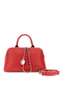 Trapezförmige Handtasche aus Kunstleder mit sichtbarem Reißverschluss, Zierkette und Metallanhänger. Ausgestattet mit einem verstellbaren und abnehmbaren Schulterriemen.