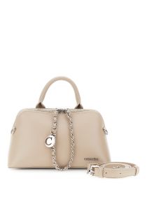 Trapezförmige Handtasche aus Kunstleder mit sichtbarem Reißverschluss, Zierkette und Metallanhänger. Ausgestattet mit einem verstellbaren und abnehmbaren Schulterriemen.