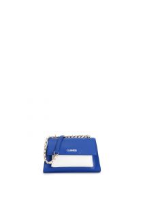 Trapeztasche mit kontrastfarbener tasche und überschlag. magnetverschluss. kettenriemen mit fädelung und gegenfarbigem logo.