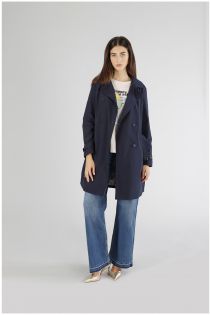 Ein unverzichtbares kleidungsstück in der frühlingsgarderobe. zweireihiger trenchcoat aus technischem stoff mit bedrucktem futter. lange ärmel.
