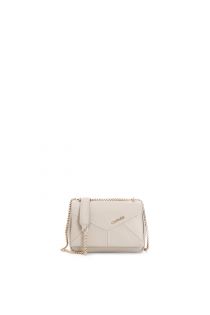Überschlag mit patchwork-verarbeitung und mikronieten-applikationen. in verschiedene fächer unterteilte tasche: eine mit reißverschluss verschlossene trennwand und eine tasche. schultergurt mit kette.