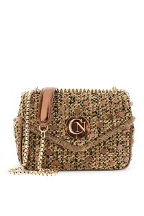 Schultertasche aus Bouclé-Stoff mit Überschlag und Paillettenapplikation. Innenliegender Reißverschluss. Rückseitiges Fach. Schulterriemen mit Kette und Metallbesatz. Gepolsterter Schulterriemen mit Metalllogo und Stofffransen.
