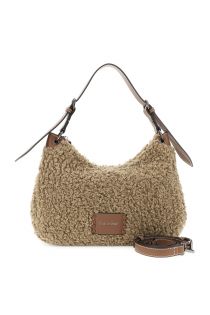 Schultertasche aus gewelltem Stoff mit kontrastierenden Details in Lederoptik. Frontplakette mit Ziernähten und Logo. Abnehmbarer Schulterriemen für zwei Tragevarianten.