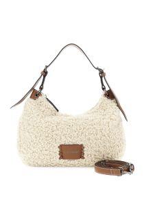 Schultertasche aus gewelltem Stoff mit kontrastierenden Details in Lederoptik. Frontplakette mit Ziernähten und Logo. Abnehmbarer Schulterriemen für zwei Tragevarianten.
