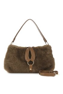 Schultertasche aus Kunstpelz mit Zierband und Ring. Logo auf der Rückseite und abnehmbarer Schulterriemen mit Karabinerhaken für vielseitigen und eleganten Tragekomfort.
